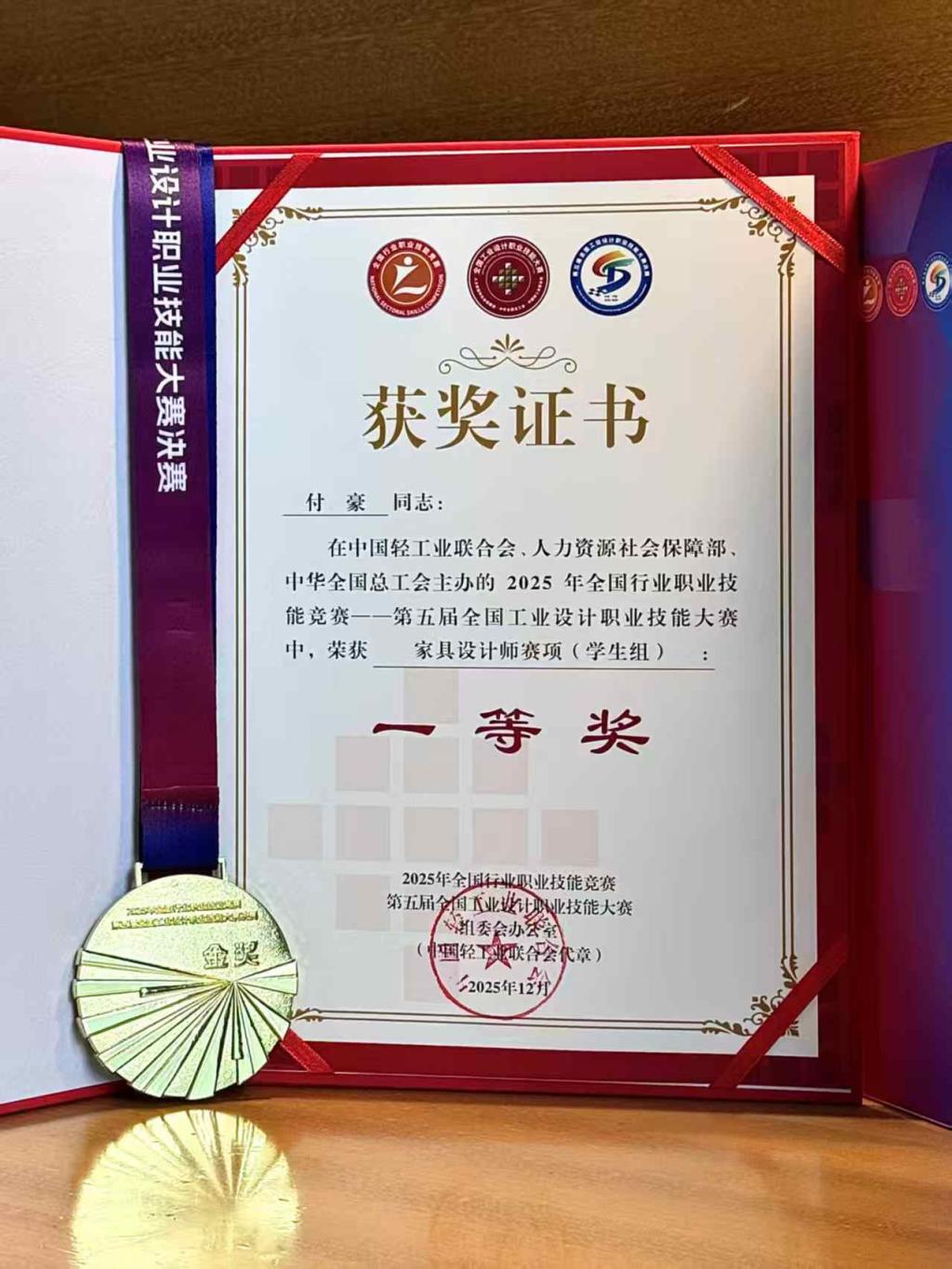 在刚刚落幕的2025年全国行业职业技能竞赛——第五届全国工业设计职业技能竞赛决赛中,我校风景园林学院家具设计与制造专业2023级付豪同学代表江苏省出征,凭借出色的设计理念、精湛的专业技能与扎实的综合素养,在竞争白热化的家具设计师赛项(学生组)中脱颖而出,一举摘得一等奖殊荣!