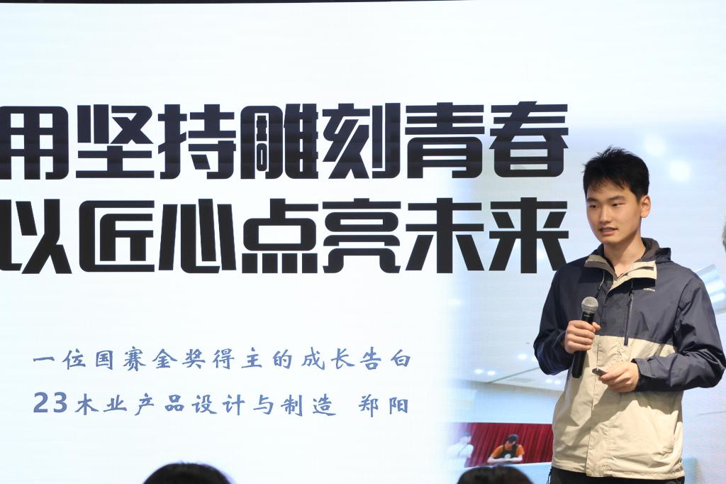 作为全国技术能手、第32届“茅以升家乡奖·优秀学生奖”获得者,李康老师以“千锤百炼‘凿’就技能报国梦”为主题,深情讲述了自己从一名普通学生到技能尖兵的蜕变之路。他用自己的亲身经历证明,唯有在专业学习中沉心静气、精益求精,方能找到自我价值,实现青春梦想。随后,2025年世界职业院校技能大赛轻工赛道金奖、全国院校青年木作技艺竞赛优胜奖获得者郑阳同学以“用坚持雕刻青春,以匠心点亮未来”为题分享了他的成长历程。从最初握刨刀时生疏的双手,到如今在国际赛场上游刃有余地展现精妙技艺,他在木屑纷飞中实现了自己的梦想。两位榜样的力量激发了同学们的学习热情与奋斗决心,大家纷纷表示,将以此为标杆,在专业学习的道路上笃行不怠。