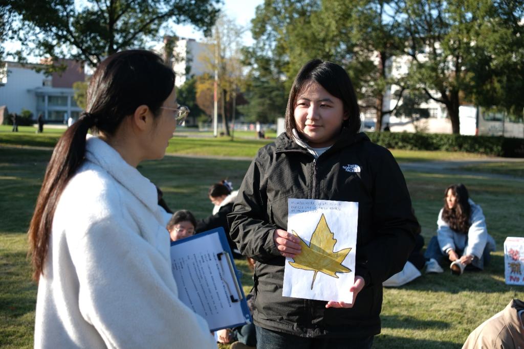 活动现场氛围轻松温馨,心理辅导员唐冬芬老师以秋日落叶为切入点,结合季节更迭的自然规律,引导新生理解情绪起伏的常态性,打破对负面情绪的认知壁垒。在“拾叶识心”环节,新生们漫步校园捡拾专属落叶,通过叶片的形态、纹理联想自身近期状态,用画笔、文字在落叶上标注情绪标签,将无形心绪转化为有形表达;“叶话心声”分享环节中,大家主动敞开心扉,围绕落叶背后的故事倾诉适应困惑、成长感悟,在彼此倾听与共情中收获理解与支持;最后,“落叶归安”互动环节以集体创作落叶情绪画收尾,在协作中体会接纳自我、凝聚力量的意义,逐步放下焦虑,重拾内心平静。