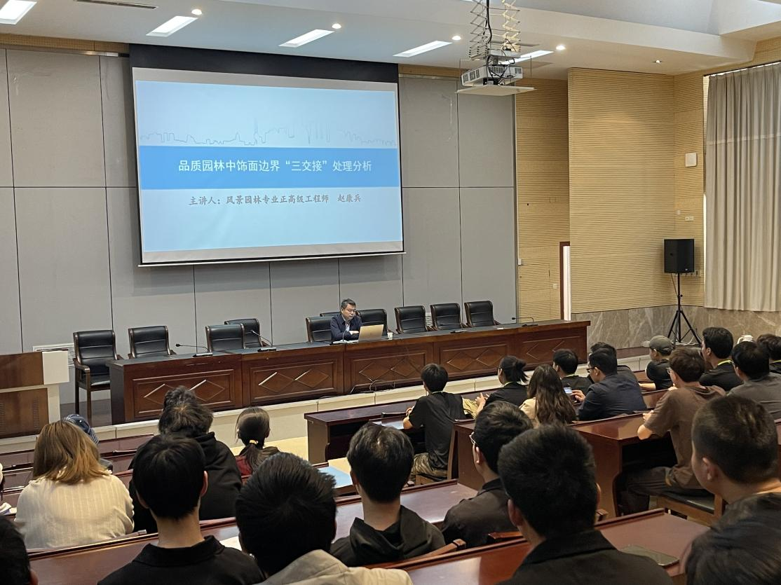 5月17日上午,由风景园林学院园林景观系主办“风景园林工程施工的总体把控和细部处理”学术讲座在研发楼报告厅举行。本次学术讲座特邀南京市园林经济开发有限责任公司总经理、江苏省风景园林协会副理事长赵康兵(正高级工程师/全国绿化劳动模范)主讲,园林景观系师生参加了本次学术活动,讲座由园林景观系王剑主任主持。