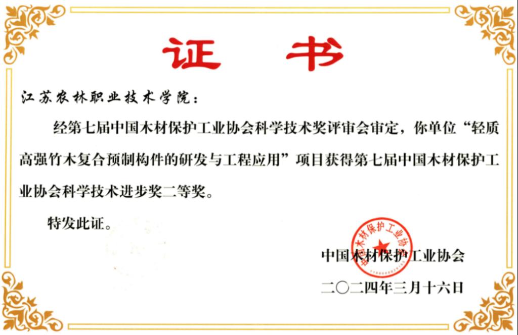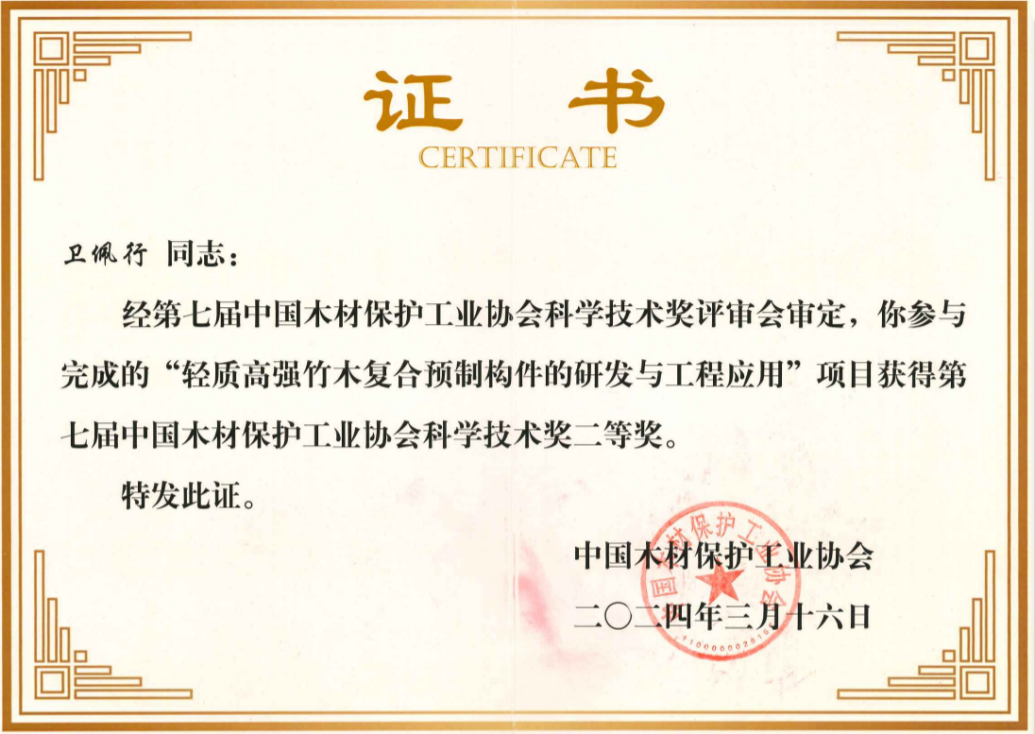 中国工程院院士李坚、吴义强、中国木材保护工业协会会长刘能文等为中国木材保护工业协会科学技术奖获奖单位颁发了证书。我院参与申报的《轻质高强竹木复合预制构件的研发与工程应用》项目经单位推荐、协会初审、专家会评和社会公示等环节,荣获第七届中国木材保护工业协会科学技术进步奖二等奖。