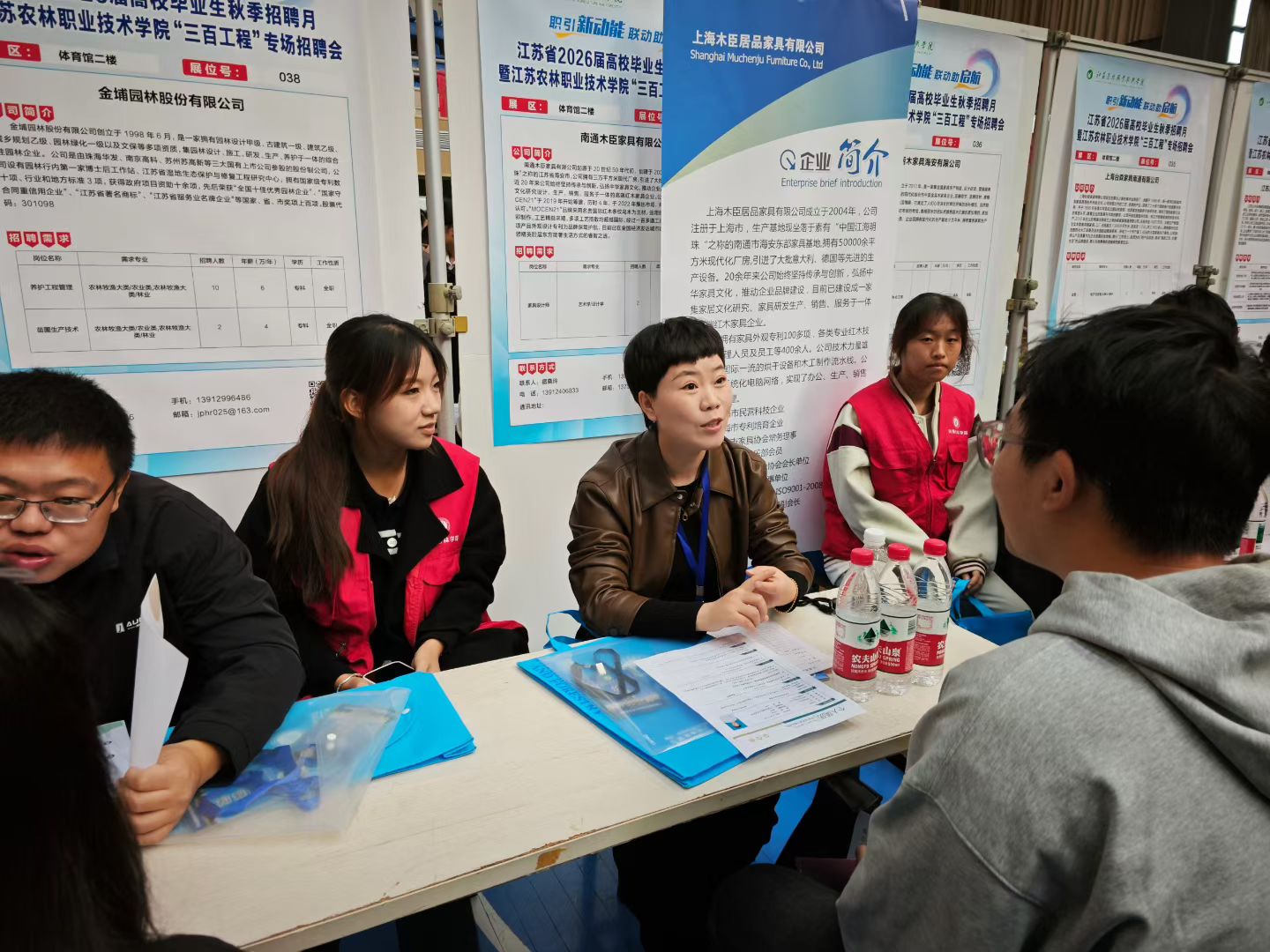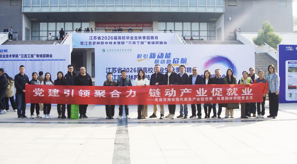 11月15日上午,江苏省2026届高校毕业生秋季招聘月暨江苏农林职业技术学院“三百工程”专场招聘会在我校举行。由南通海安现代家具产业链党委牵头组织的中国东部家具产业基地的12家国内知名家具企业组团到校参加人才招聘。这也是自去年风景园林学院党总支与南通海安现代家具产业链党委开展党建共建以来,海安市第二次组团人才招聘。此次招聘会,12家企业提供近100个就业岗位,涉及家具设计、生产工艺、电商物流等岗位。