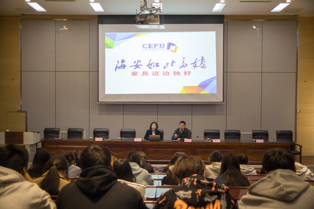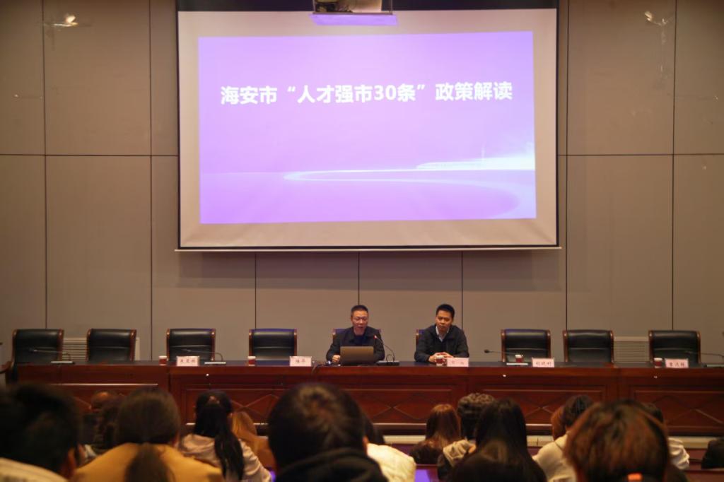 招聘会期间,海安市人才中心副主任陆华从创新创业人才政策、青年人才引进政策、人才平台载体政策、市场主体引才政策和人才生态环境政策5个方面为2026届毕业生作了“海安市人才强市30条政策解读”;海安市家具行业协会副秘书长刘晓利作“海安如此多娇,家具这边独好”宣讲,为毕业生介绍了中国东部家具产业基地发展状况,并向毕业生们抛出邀请的橄榄枝。