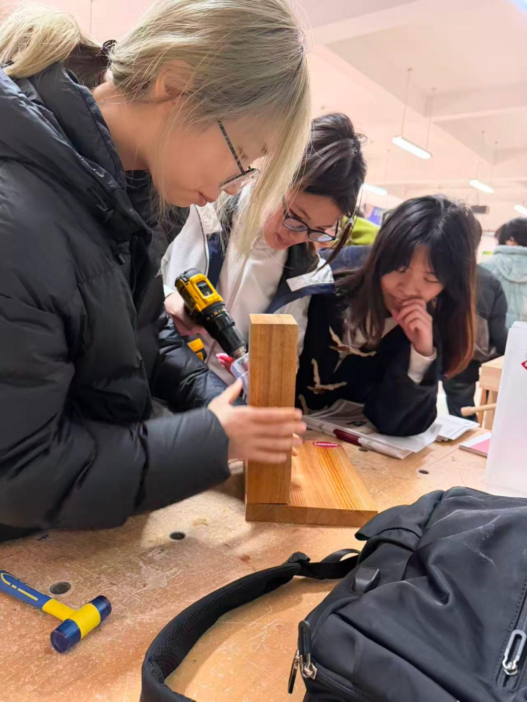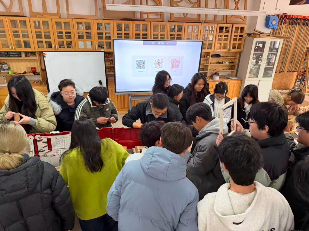 在实操演示环节,企业带来了隐形连接系统样品及配套加工设备,现场演示了多角度钻孔、精确定位与无缝组装及磁性螺丝连接系统。同学们在王经理的指导下亲手尝试操作,直观感受精密机械与创新设计结合的实践魅力。