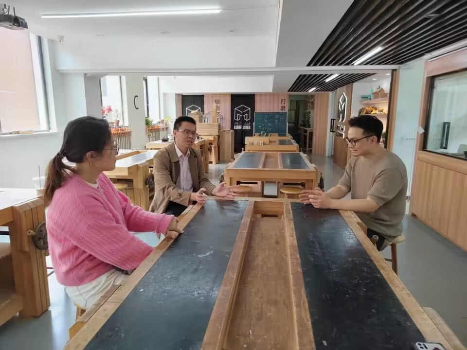 M.Y.Lab木艺实验室,位于南京,是一家集木质文创产品设计、打样、加工、定制、课程体验、家具定制为一体的木产品体验店。熊书记与公司陈总就开展实境课堂教育、学生实习实训进行了交流。陈总提出,公司课程体验业务受到众多年轻人的欢迎,希望招募更多热爱木艺、勇于实践、善于创新的新生力量加入公司团队,同时也为我院毕业生就业创业打开新的思路。