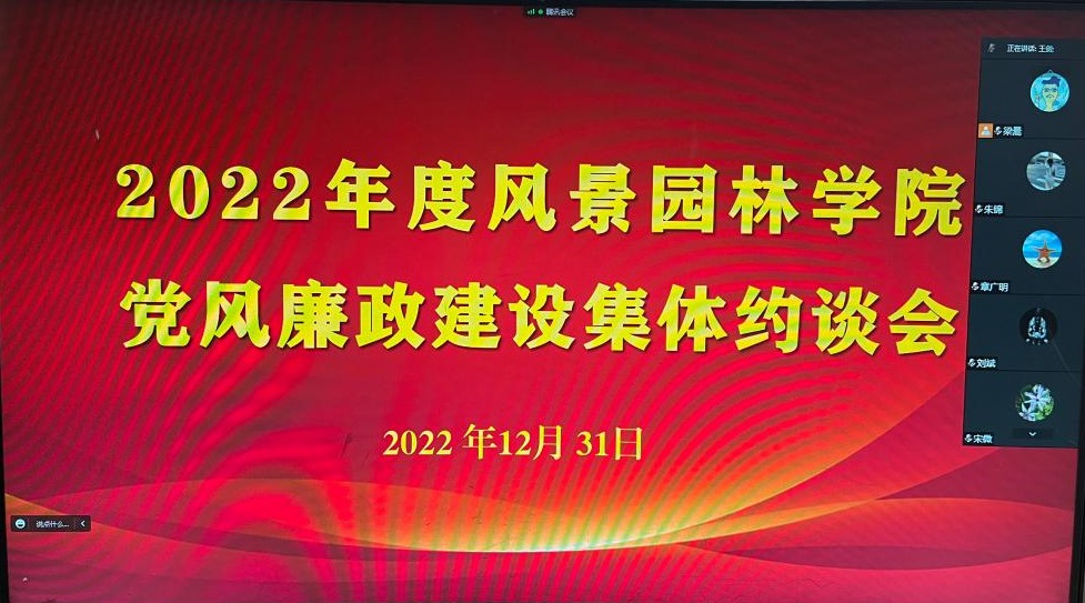 12月31日,风景园林学院党总支召开2022年度风景园林学院党风廉政建设集体约谈会,会议采用线上会议召开,党总支委员、内设机构负责人及教师代表参加会议,会议由党总支纪委委员宋微同志主持。
