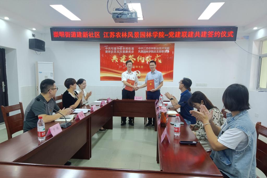 蒋铭午主任首先介绍了建新社区的社区概况及党建工作的成效和亮点。熊伟书记结合学院木工、花艺、盆景等专业特色及学生志愿者参与,给出了建议。双方围绕“党员先锋”双创工作室、“党性修养”大讲堂、“关爱互助”活动等内容展开交流,并签订共建协议。